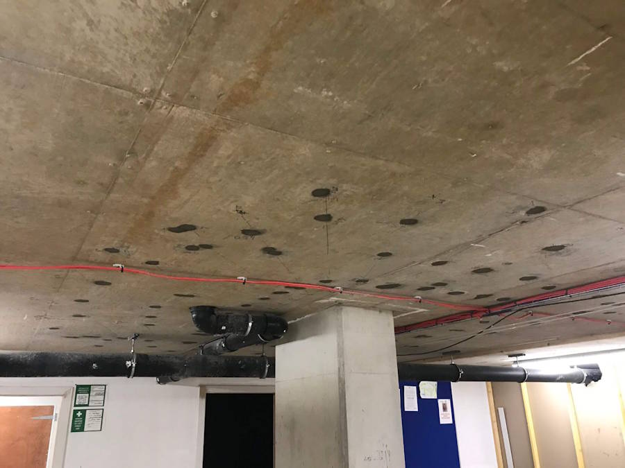 Beta Design Consultants worked with Castle Group Engineers to prepare a method statement that addressed all these risks. A ferro scan was carried out to ensure position of rebar was established prior to specifying studs locations. A trial stud installation was carried and findings reviewed by BDC Engineers. The installation sequence allowed for the measurement of existing slab thickness prior to drilling to avoid piercing through the slab. The repair was carried out successfully by specialist concrete repair contractor Castle Group.