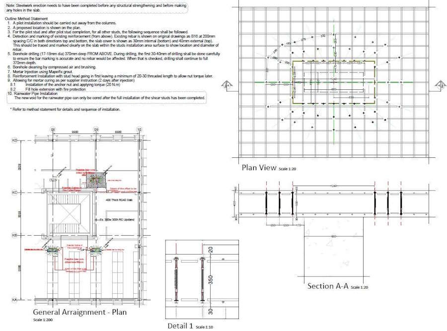 Beta Design Consultants solution was to drill the slab and install specially designed studs, with a domehead and a nut washer assembly. These studs were installed vertically from above in special grout. Following grout curing, the studs were torqued. The studs were checked for steel resistance, bond strength and pull-out strength and a sufficient number of studs were used to counteract the shear force that exceeded the concrete shear strength without reinforcement.